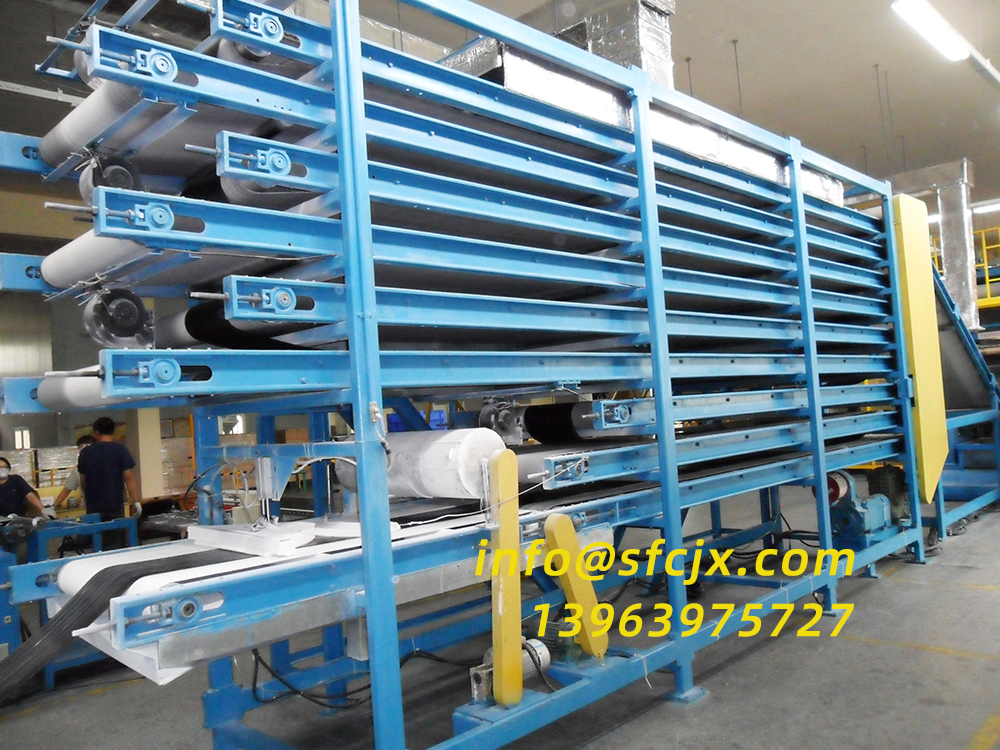網帶式膠片冷卻機采用輸送帶全程輸送膠片,避免膠片在掛桿由于重力的拉伸,使用于生產高品質的膠片,可以適應生產1mm以下的膠片。該膠片冷卻機操作簡單、節(jié)省人工、全自動運行,不需用隔離劑槽冷卻。將膠片送入輸送帶后,橡膠片會在輸送帶上多層往復運行冷卻,然后經過涂粉隔離,最后裁斷、擺片或卷曲。